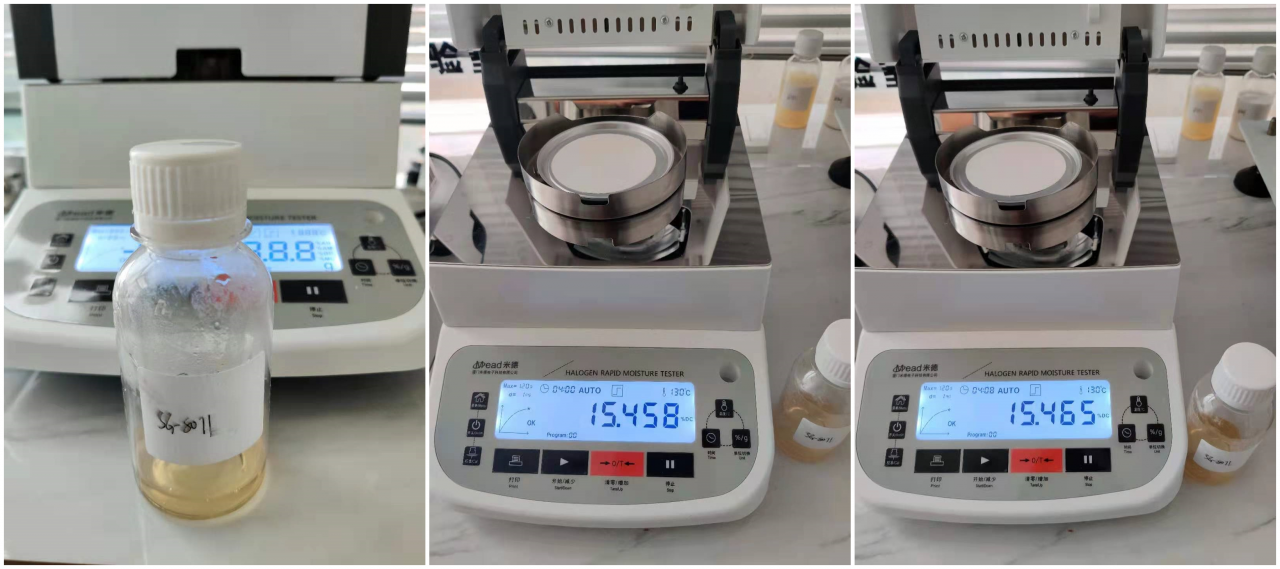 7、重復上述步驟,繼續測試溶液3,測得溶液3兩次測試的固含量結果為15.458%和15.465%,誤差為0.007%。