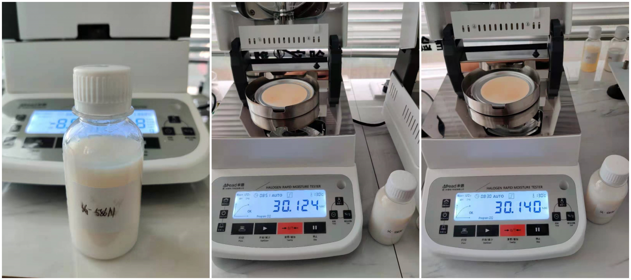 5、復位儀器,待儀器冷卻至40℃以下后,再取等量的溶液1均勻滴在玻璃纖維紙上,重復上述測試步驟;測試結束后得出第二組數據,顯示樣品的固含量為30.140%;兩次測試誤差為0.016%,表示測試結果可靠,可重復性好。